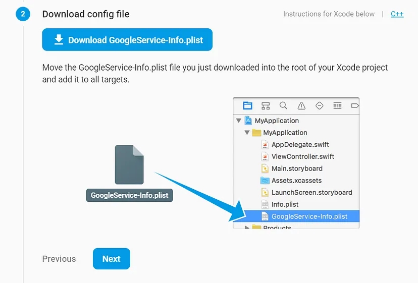 Download the GoogleService-Info.plist file & move the GoogleService-Info.plist file you just downloaded into the root of your Xcode project and add it to all targets. Make sure the config file is not appended with additional characters, like (2).